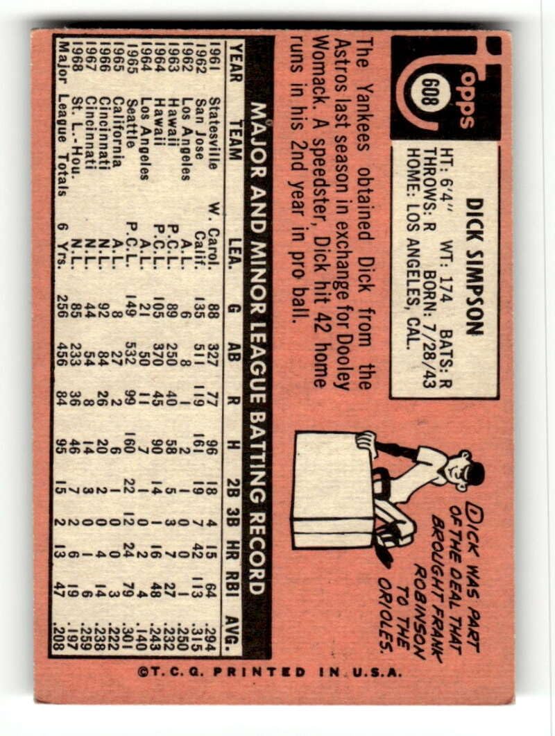1969 Topps (EX) #608 Dick Simpson New York Yankees MLB Vintage Baseball Trading Card