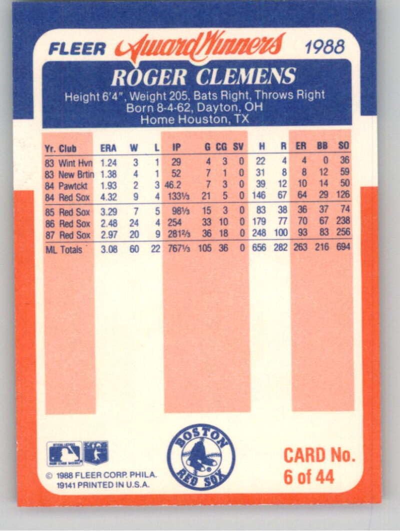 1988 Fleer Award Winners #6 Roger Clemens Boston Red Sox Official Baseball Card in Raw (EX or Better) Condition