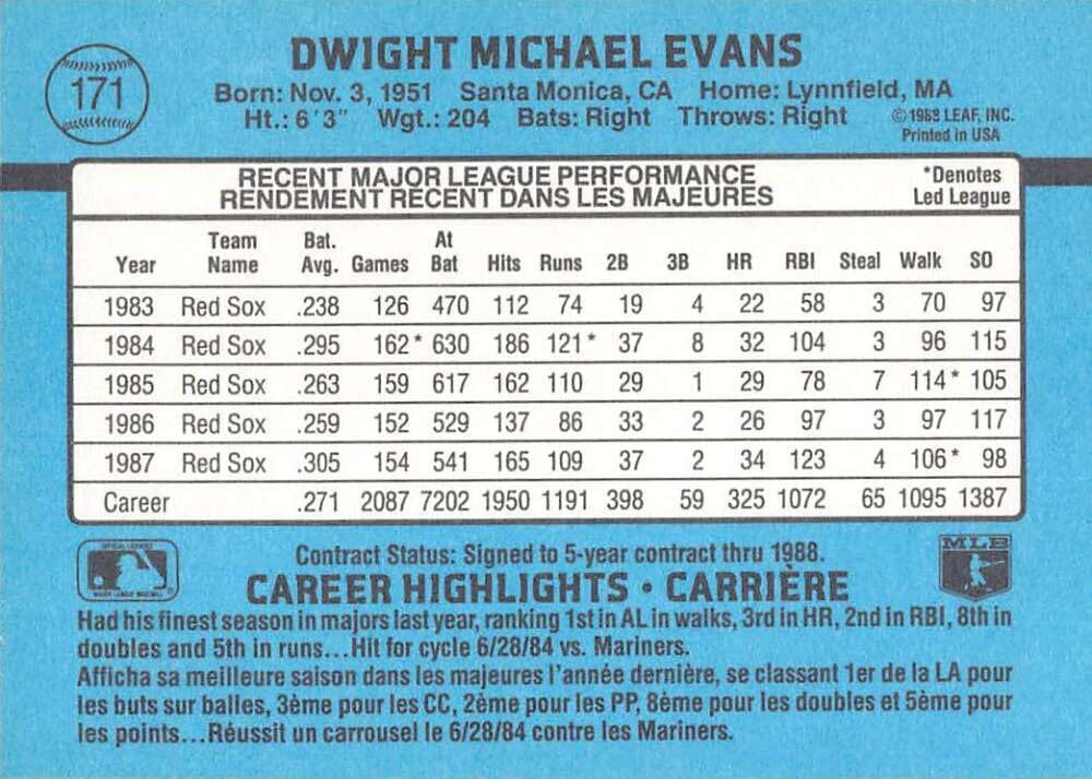 1988 Leaf #171 Dwight Evans Boston Red Sox Official Baseball Card in Raw (NM or Better) Condition