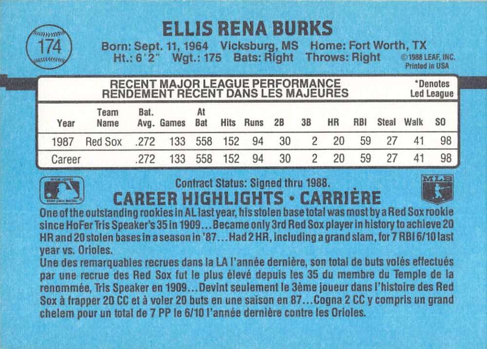 1988 Leaf #174 Ellis Burks Boston Red Sox Official Baseball Card in Raw (NM or Better) Condition