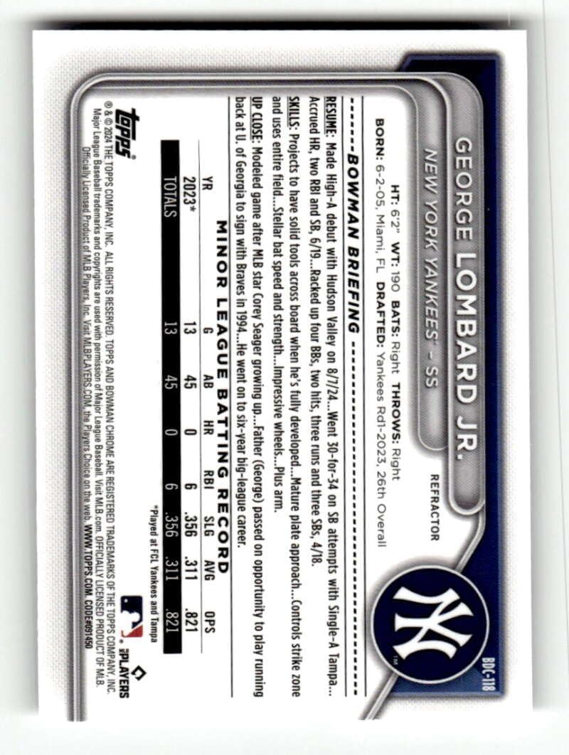 2024 Bowman Chrome Draft Refractor #BDC-118 George Lombard Jr. RC Rookie New York Yankees Baseball Trading Card