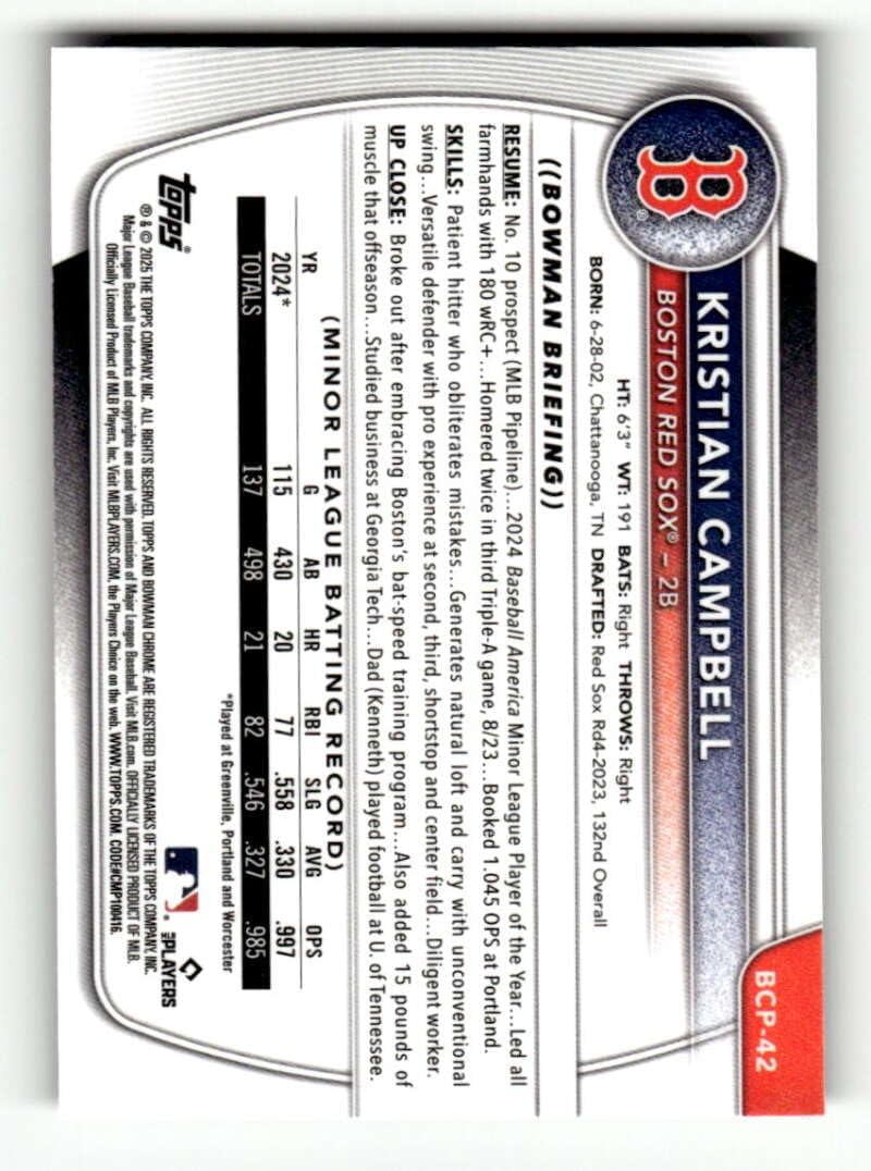 2025 Bowman Chrome Prospects Reptilian Refractor #BCP-42 Kristian Campbell Boston Red Sox MLB Baseball Trading Card