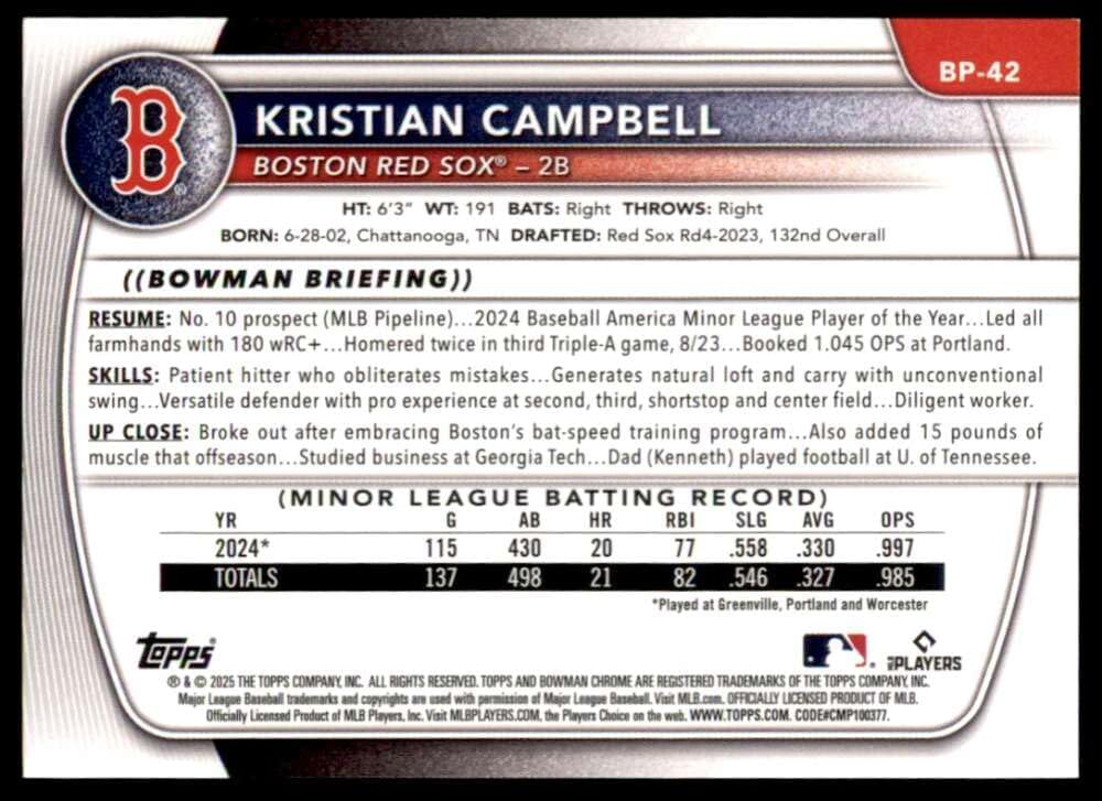 2025 Bowman Prospects #BP-42 Kristian Campbell Boston Red Sox RC Rookie MLB Baseball Base Trading Card