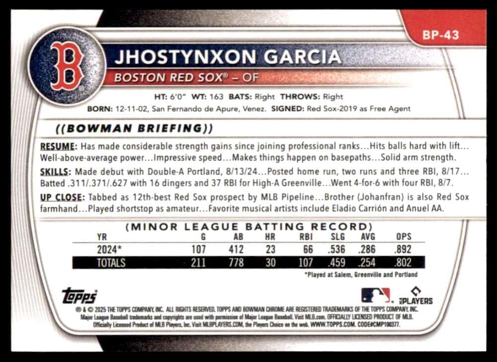 2025 Bowman Prospects #BP-43 Jhostynxon Garcia Boston Red Sox RC Rookie MLB Baseball Base Trading Card