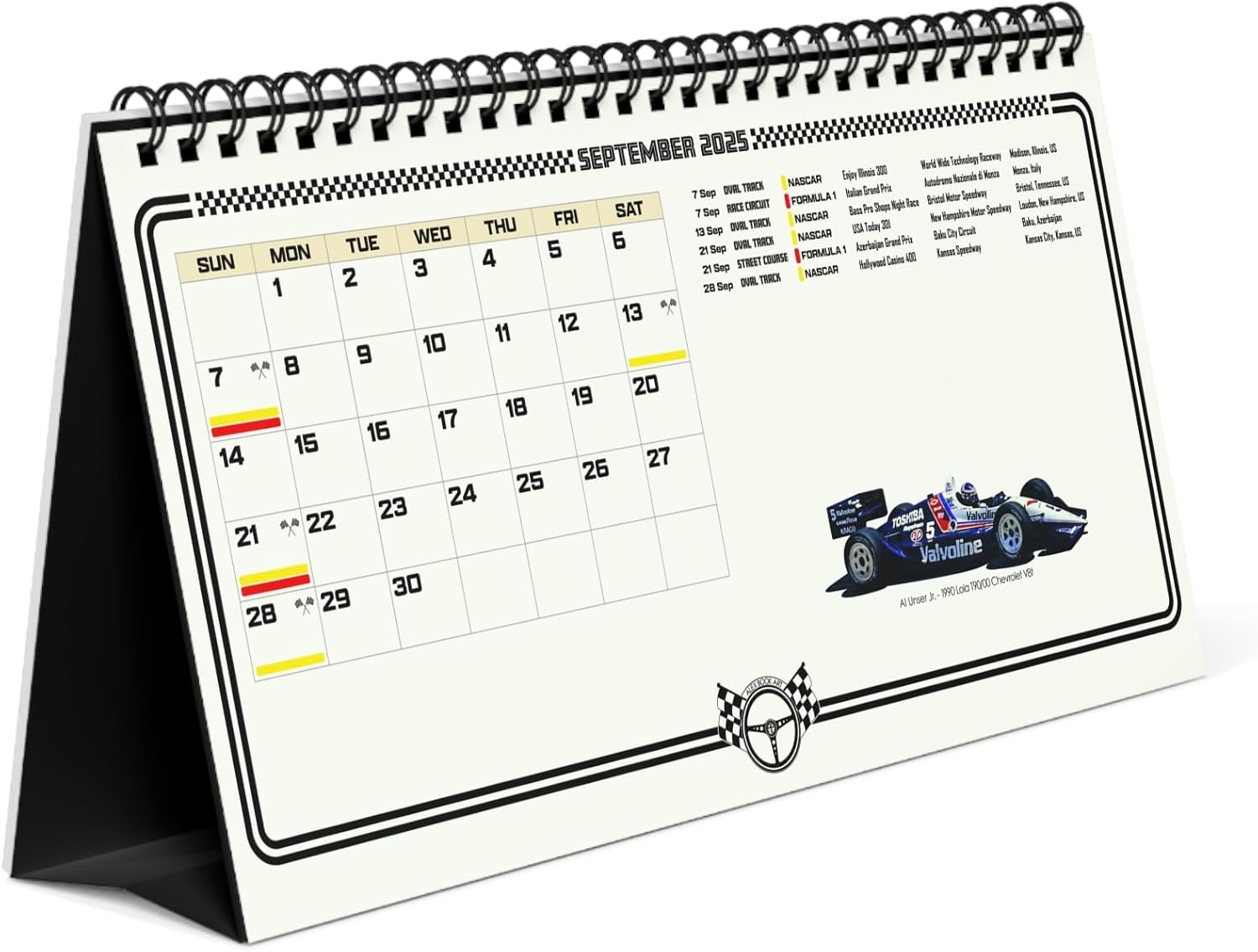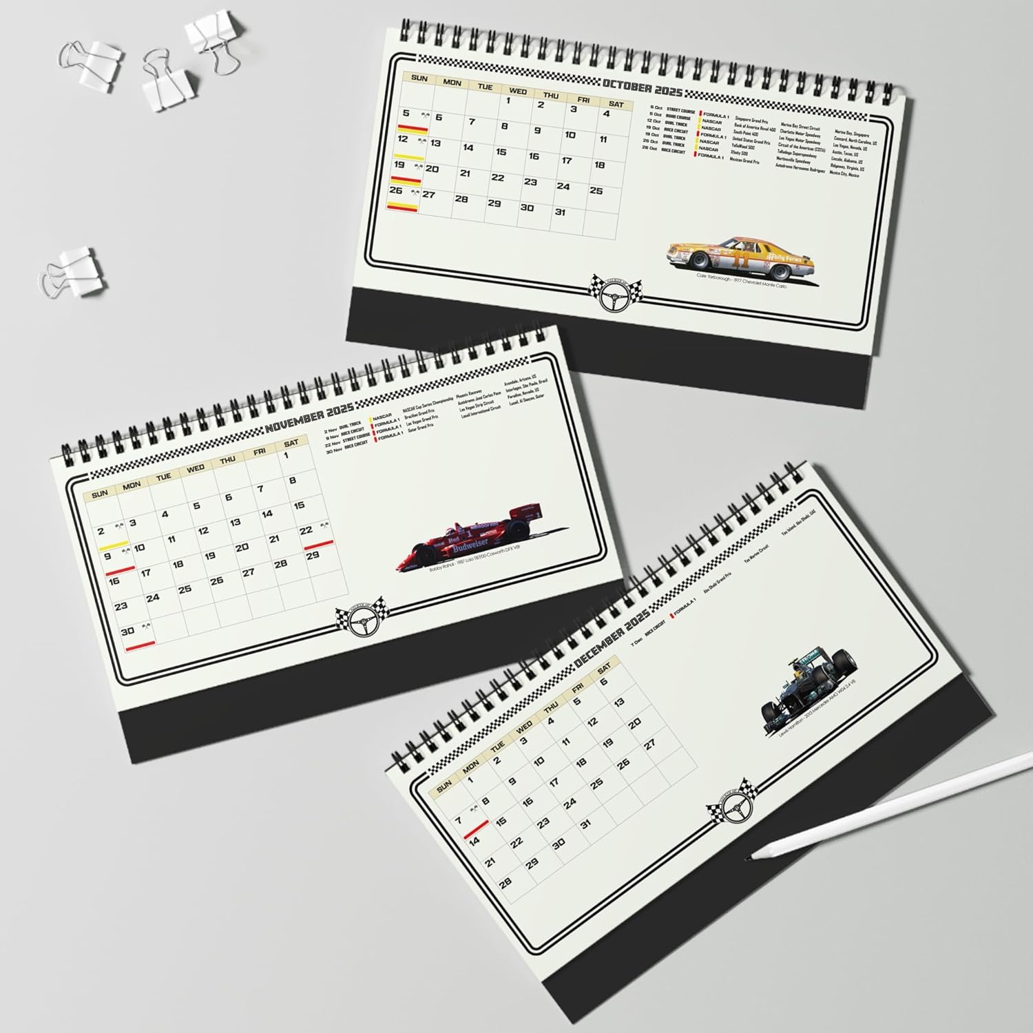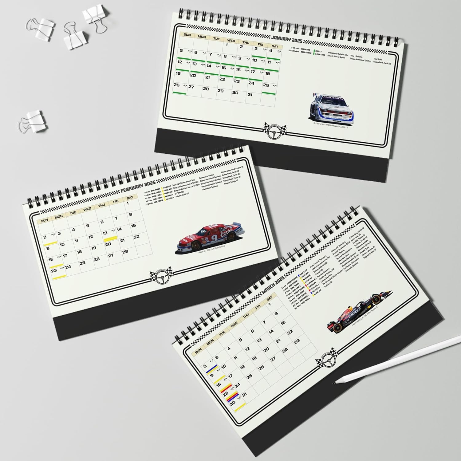 Discover the ultimate motorsport calendar for 2025, blending art and racing history in one exclusive package. Designed by Alex Book Art, this desktop calendar features 12 illustrations of legendary drivers and cars that defined motorsport greatness. What sets this calendar apart is its detailed race schedules, covering every major event of the year: – 2025 Formula 1 schedule – 2025 NASCAR Cup Series schedule – 2025 IndyCar Series schedule – 24 Hours of Le Mans, plus other iconic races around the world Each schedule provides essential details like event name, series type, date, location, and track configuration (Race Circuit, Road Course, Street Course, or Oval Track). Product Highlights: Desktop size: 10″ x 5″ (25cm x 12.5cm), compact and functional Spiral binding for easy use and display High-quality 250gsm paper with vibrant, sharp images Exclusive design featuring original artwork by Alex Book. This calendar honors the courage and skill of legendary racers, with each month featuring a driver and car: January: Bobby Unser – 1986 Audi Sport Quattro SL Hill Climb February: Bill Elliott – 1988 Ford Thunderbird NASCAR March: Max Verstappen – 2022 Red Bull RB18 Formula 1 April: Dale Earnhardt – 1990 Chevrolet Lumina NASCAR May: A. J. Foyt – 1977 Coyote 75 Foyt V8 IndyCar June: Ken Miles/Denny Hulme – 1966 Ford GT40 Mk.II Le Mans July: David Pearson – 1972 Mercury Cyclone NASCAR August: Gilles Villeneuve – 1978 Ferrari 312T3 Formula 1 September: Al Unser Jr. – 1990 Lola T90/00 Chevrolet V8t IndyCar October: Cale Yarborough – 1977 Chevrolet Monte Carlo NASCAR November: Bobby Rahal – 1987 Lola T87/00 Cosworth DFX V8t IndyCar December: Lewis Hamilton – 2013 Mercedes AMG W04 Formula 1. This calendar is more than just a schedule—it’s a celebration of motorsport culture and an ideal gift for any racing fan. Whether for birthdays, Christmas, New Year, or just because, it’s a perfect way to honor the thrill of motorsport.