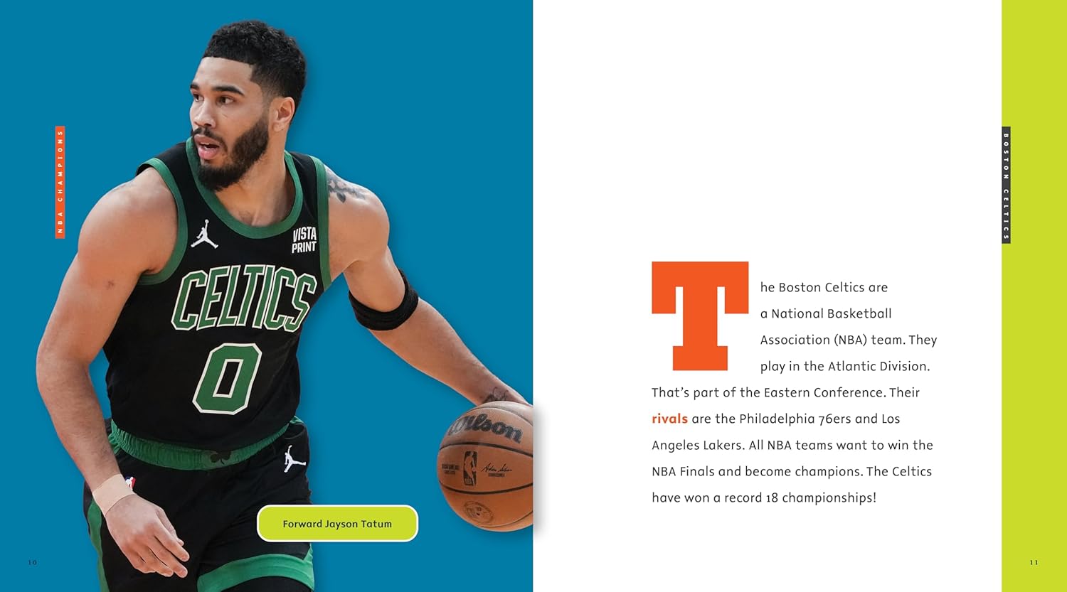 Throw down a slam dunk with young sports fans! Each of the elementary-level nonfiction titles in this series introduces the history of the featured National Basketball Association (NBA) championship team, where it plays home games, star athletes and coaches, and memorable moments. Vibrant layouts spotlight professional players of different eras, and an “About the Team” section recaps important facts. For kids in grade 3 and up who love the Boston Celtics, this nonfiction history of the franchise’s National Basketball Association (NBA) championship wins is a slam dunk! Approachable, elementary-level text and dynamic photos explain the professional basketball team’s records and memorable NBA championships. Vibrant, color-blocked layouts spotlight sensational players of different eras, such as Larry Bird and Jayson Tatum. An “About the Team” page reviews important facts for rookie sports fans. Includes a table of contents, labeled images, a glossary, and an index.