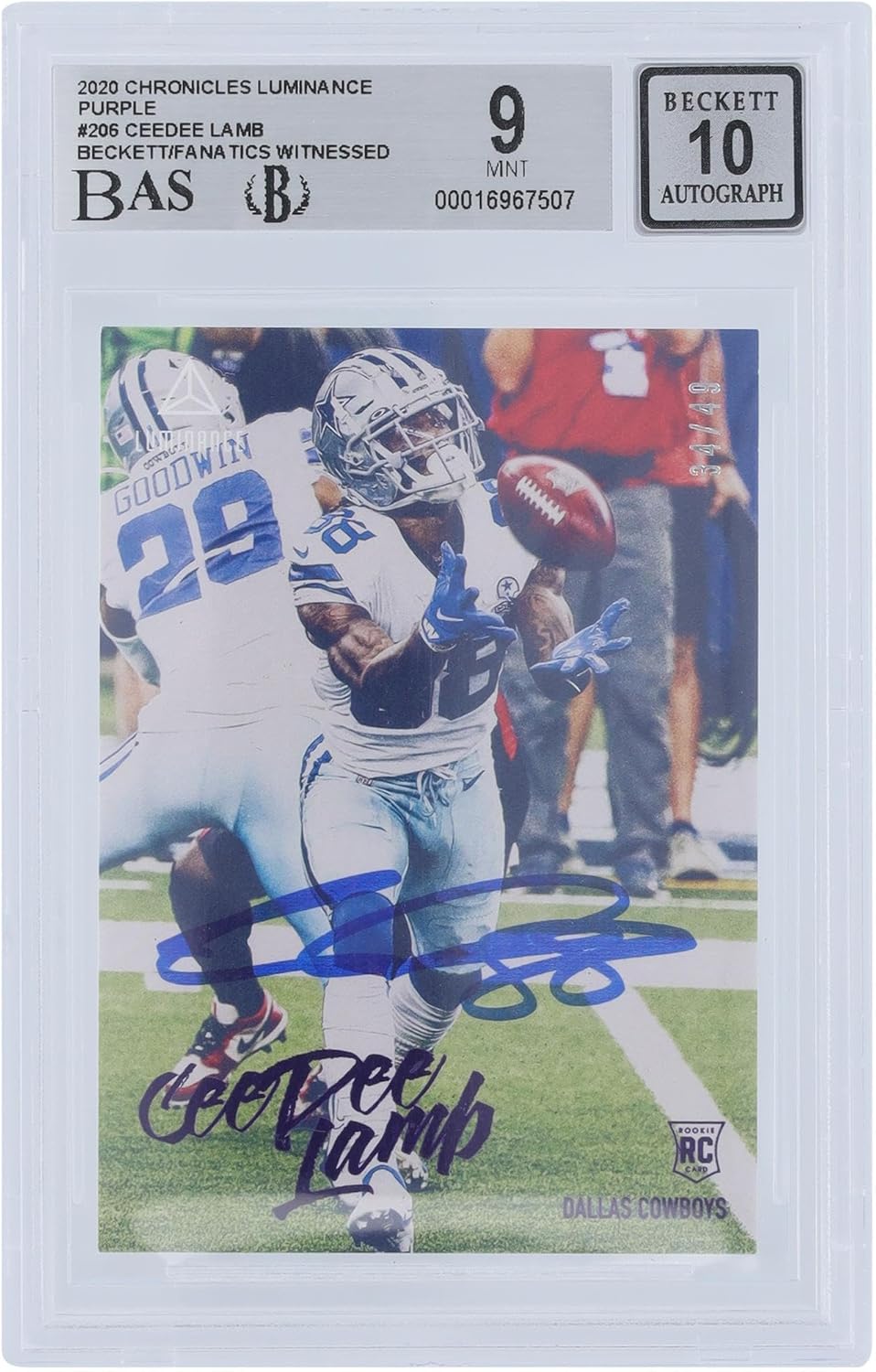 CeeDee Lamb Dallas Cowboys Autographed 2020 Panini Chronicles Luminance Purple #206 Beckett Fanatics Witnessed Authenticated 9/10 Rookie Card . If a product is unsigned or non game-used, a hologram will not be included. CeeDee Lamb memorabilia. Dallas Cowboys memorabilia.