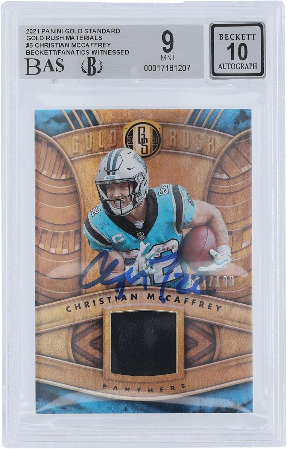 Christian McCaffrey San Francisco 49ers Autographed 2021 Panini Gold Standard Gold Rush Materials #GR-CM #/199 Beckett Fanatics Witnessed Authenticated 9/10 Card . If a product is unsigned or non game-used, a hologram will not be included. Christian McCaffrey memorabilia. San Francisco 49ers memorabilia.