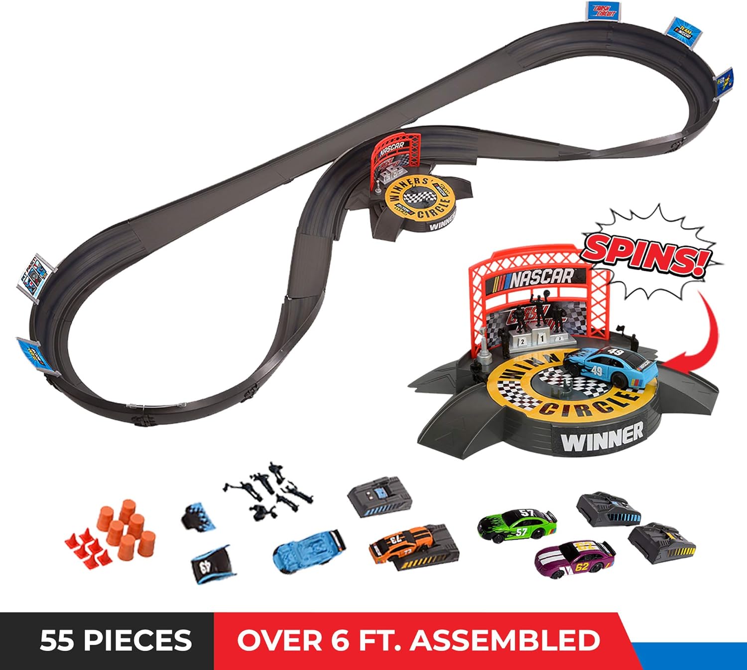 THE COMPLETE PACKAGE – Our Ultimate Bundle includes 1 Track Set (19 pieces), 1 Winner’s Circle Stand, 1 Winner’s Circle Backdrop, 4 Electric Powered Vehicles, 4 Flash Chargers, 6 Driver and Pit Crew Figurines, 1 Trophy, 6 Track Billboards, 6 Crash Barrels, 6 Crash Cones, and 1 Label Sheet.