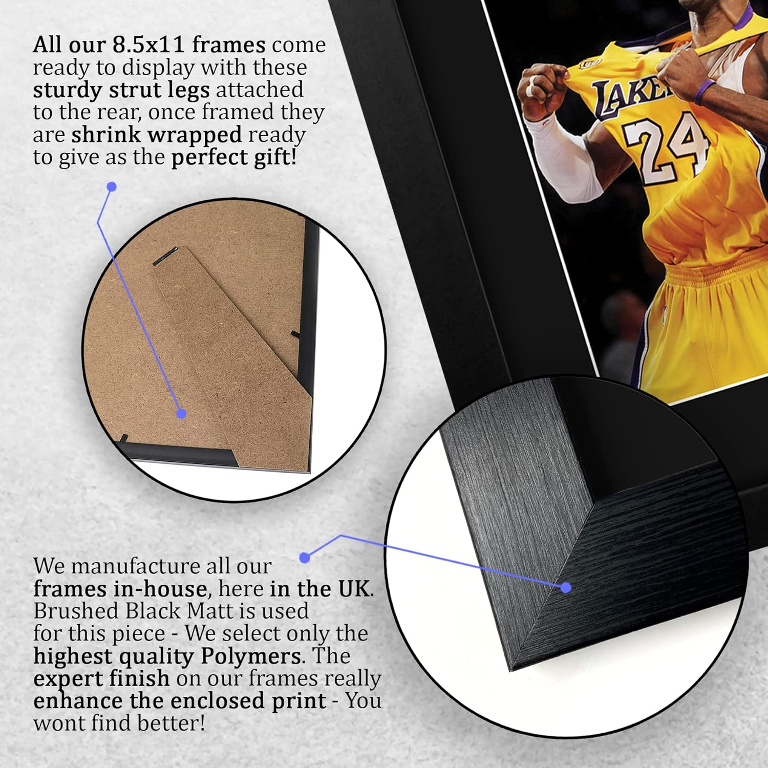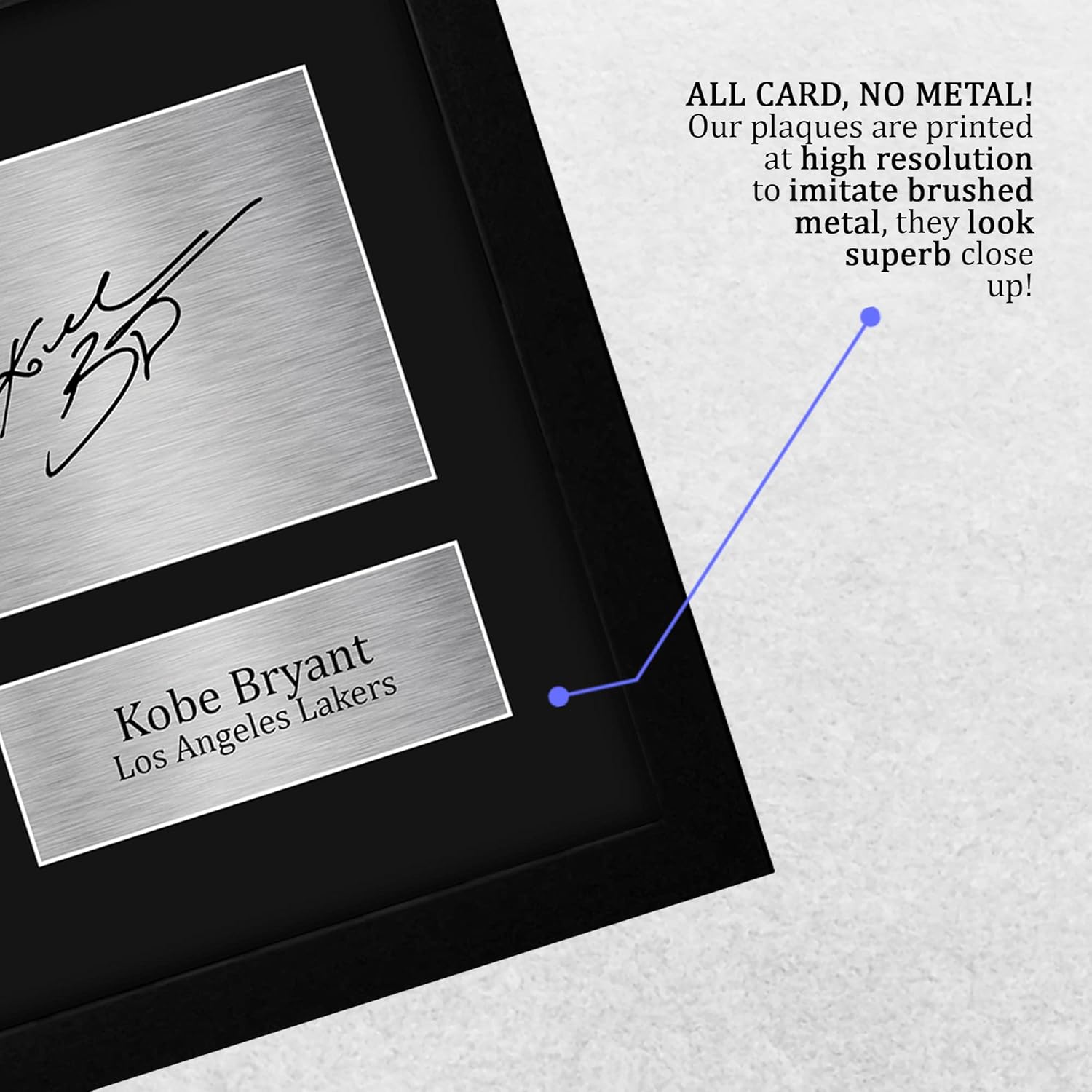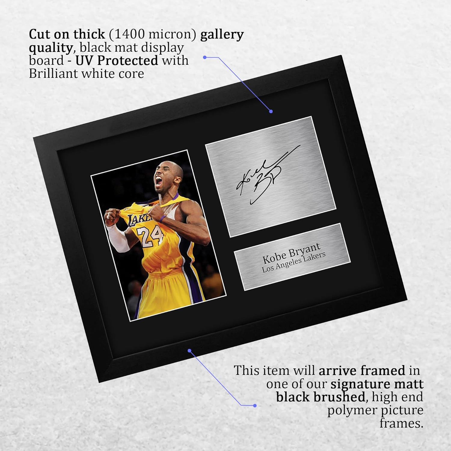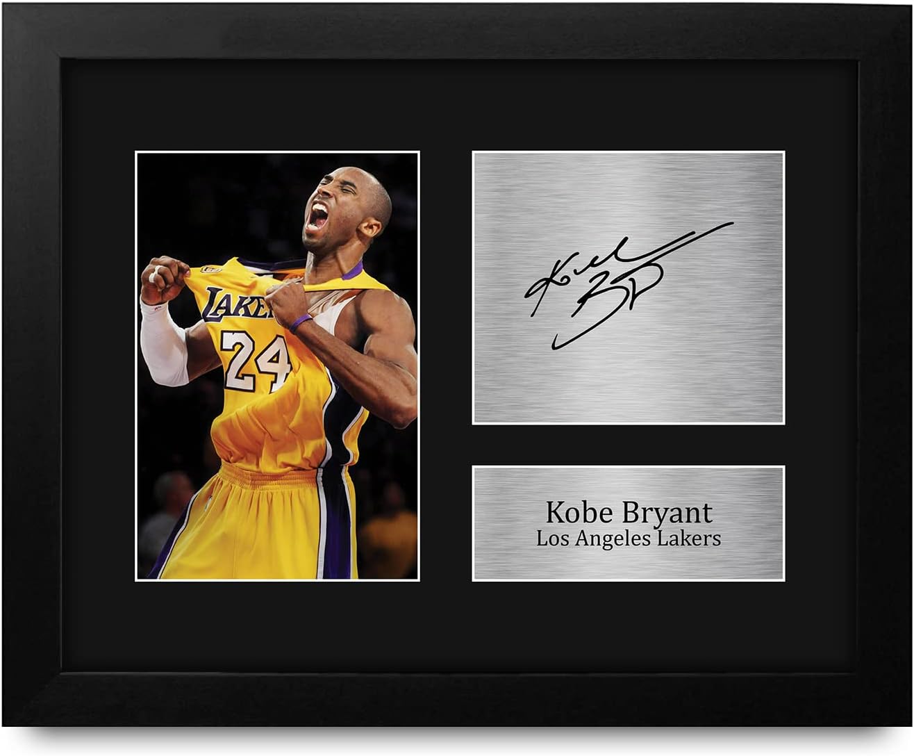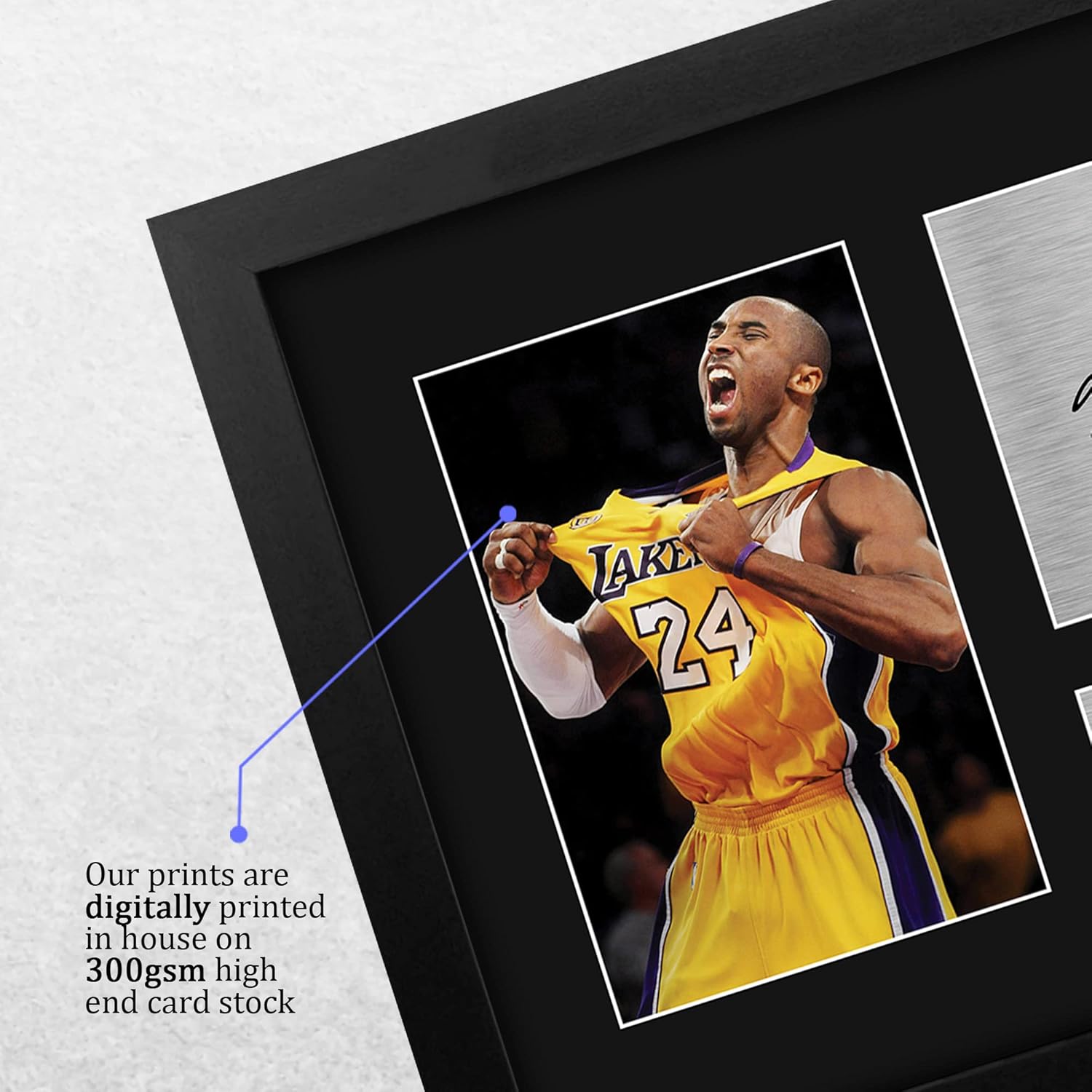 Professionally made in our studio, this US Letter Size (8.5×11 Inch) framed Kobe Bryant display makes for an ideal gift idea. This laser printed quality photograph is mounted in a precision cut three windowed acid-free matt black display board. To the left of the display there is the main image. To the right of the display there are two metallic effect plaque areas for printed copies of the name and autograph signature. This print comes framed in a sleek black polycarbonate frame that compliments the matt mount display. Lightweight, but of the highest quality, these make the ideal Christmas/Birthday gift for fans of all ages, and best of all, they definitely won’t break the bank!