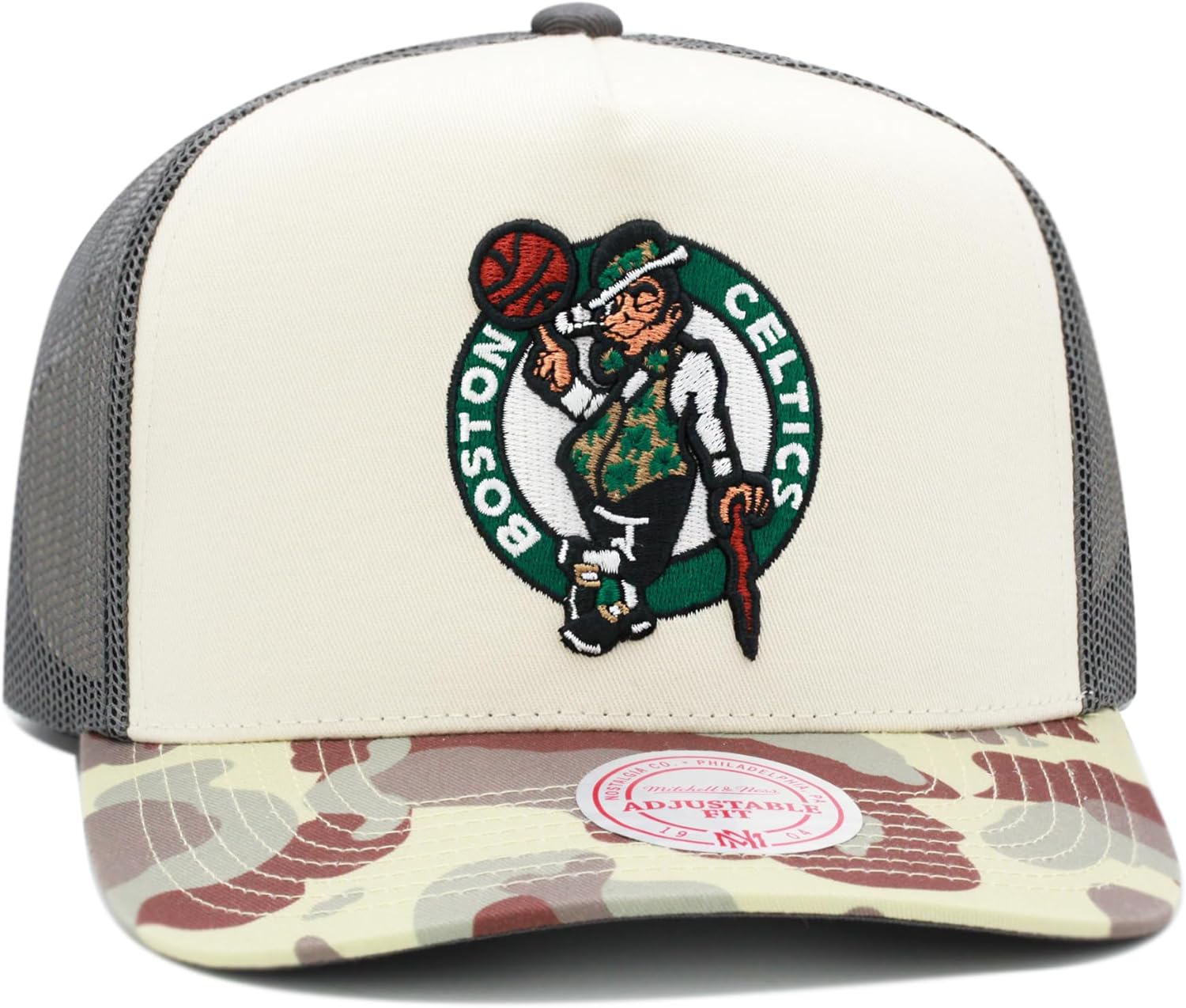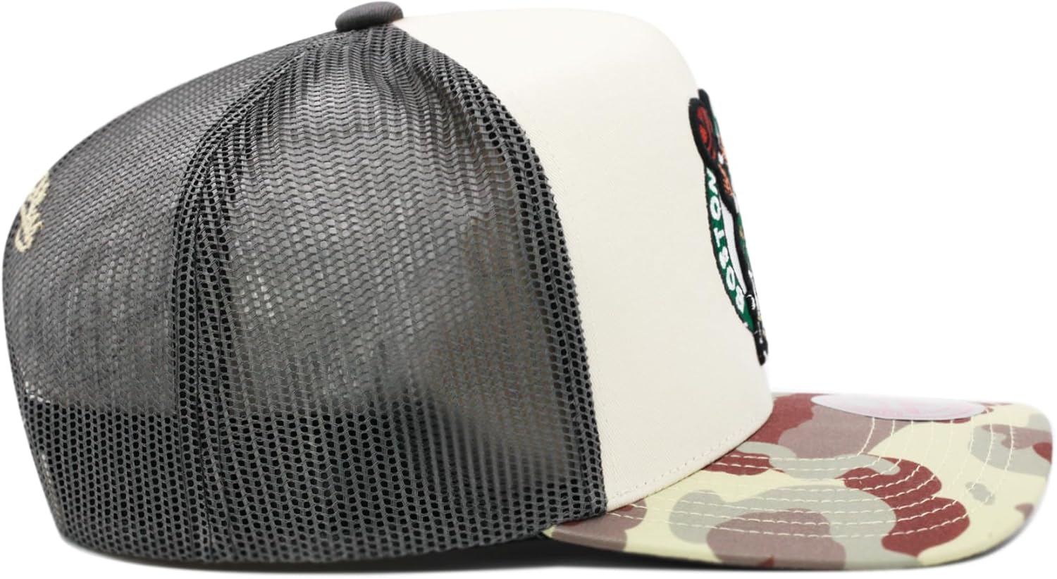 Mitchell & Ness Boston Celtics NBA Hidden Trucker Mesh Snapback Hat Adjustable Cap – Khaki/Duck Camo