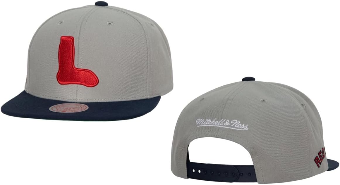 Boston Red Sox Away Cooperstown Mitchell & Ness Snapback. Boston Red Sox Retro Logo on a Gray Crown with Blue Bill. Mitchell & Ness Logo on Back. Green UnderBill.
