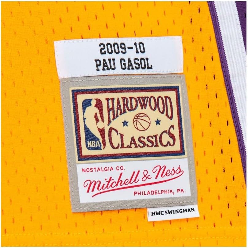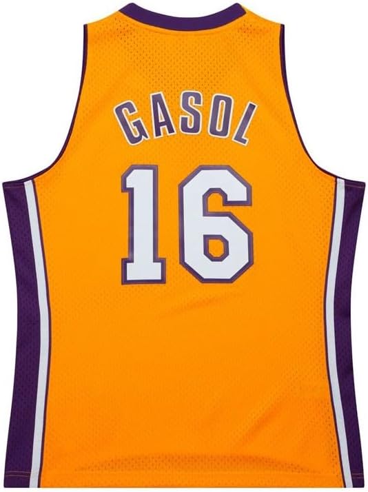 This is a Pau Gasol Los Angeles Lakers Gold 2009-10 mens Swingman jersey. Made by Mitchell & Ness, this jersey has heat sealed printed twill front logo, player name, and numbers. Fits true to size. Officially licensed.