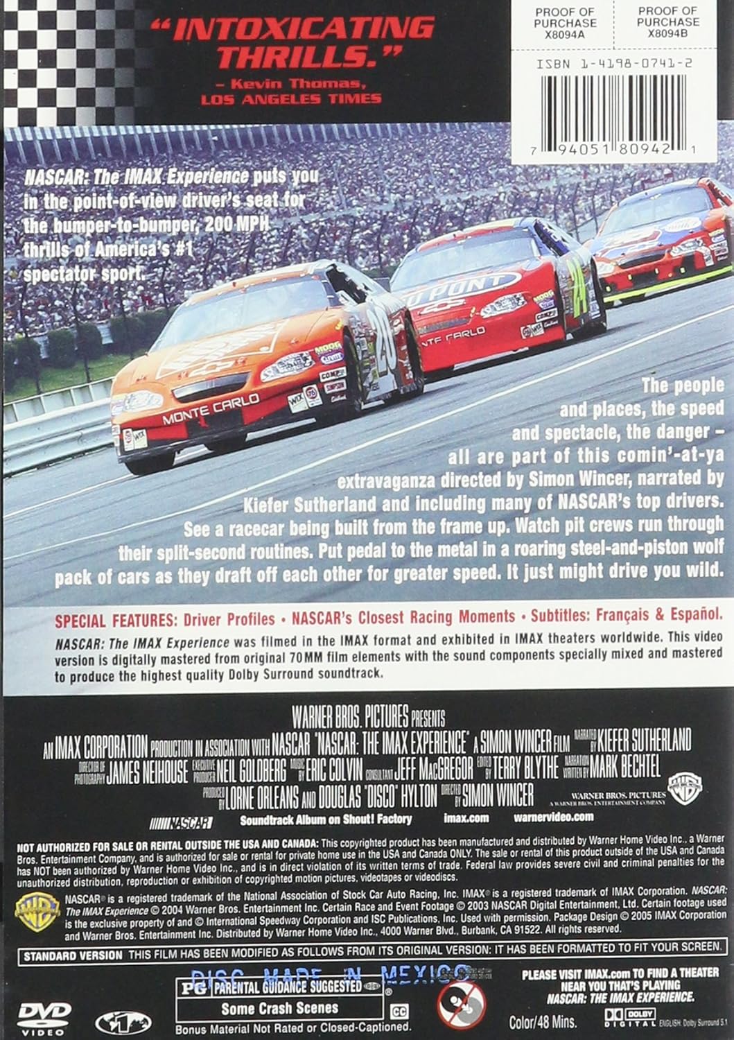 NASCAR: The IMAX Experience puts you in the point-of-veiw driver’s seat for the bumper-to-bumper, 200 MPH thrills of America’s #1 spectators sport. NASCAR: The IMAX Experience was fimled in the IMAX format and exhibited in IMAX theaters worldwide. This video version is digitally mastered from original 70MM film elements with the sound components specially mixed and mastered to produce the highest quality Dolby Surround soundtrack. Subtitles: Francais & Espanol.