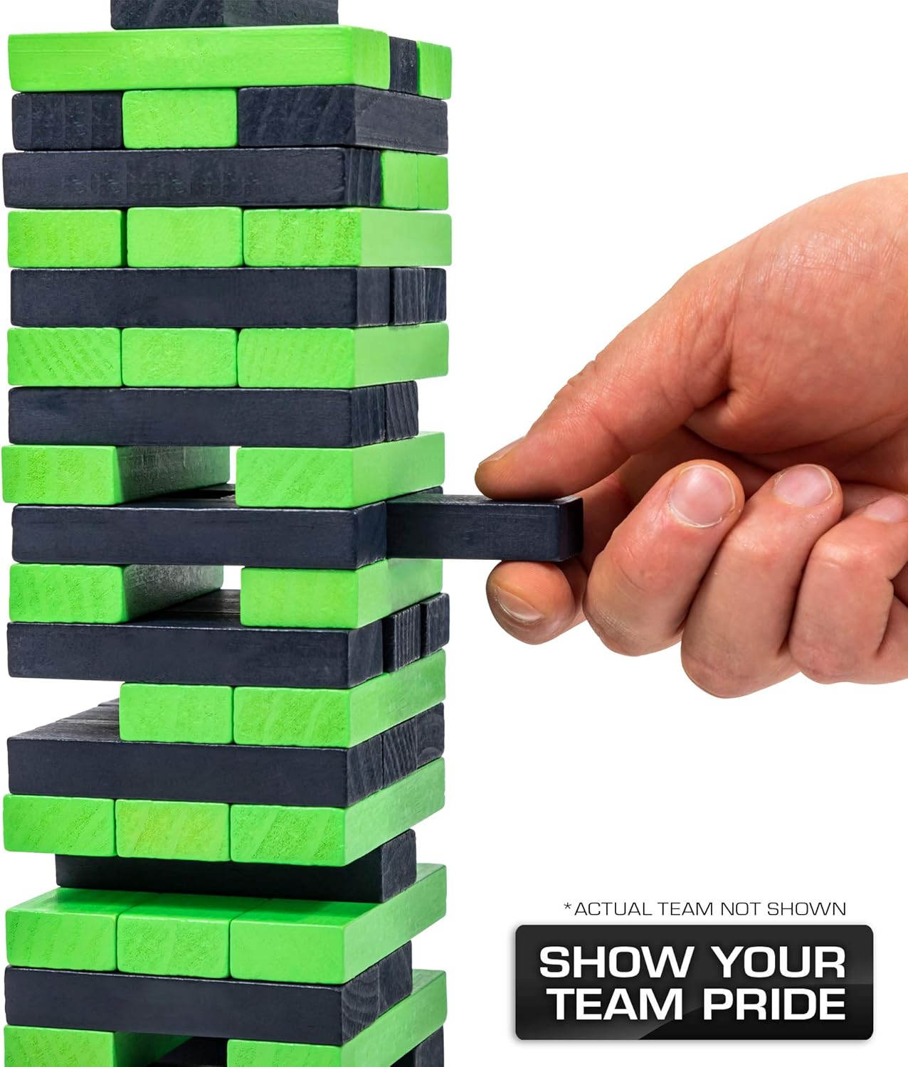 A CLASSIC JENGA GAME, IN YOUR FAVORITE NFL TEAMS – A wooden block game that challenges players to push and pull stacking blocks from the tower and strategically place them back on top. Last player standing without knocking the tower down, WINS.