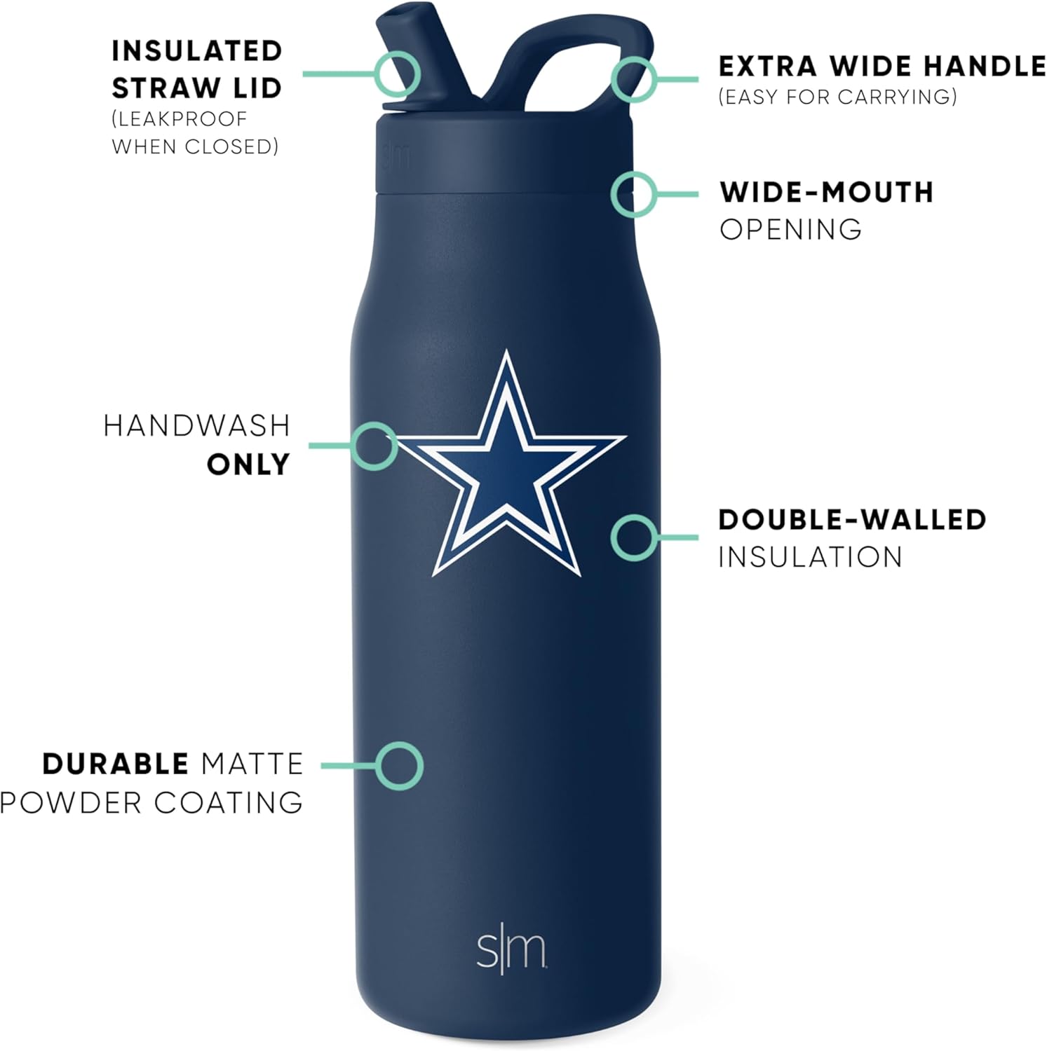 The Simple Modern Officially Licensed NFL Mesa Water Bottle is Simple Modern’s newest water bottle line. This product was intentionally designed with a wide mouth opening – perfect for adding ice and making it easier to clean. The Mesa water bottle is internally threaded to provide premium insulation, and the bottle is made from double walled stainless steel, keeping your beverage cold for hours! It comes with a straw lid that is leak-proof and has a large handle for carrying.